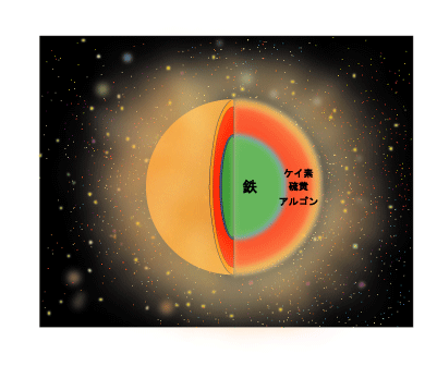 図2: ティコの超新星が爆発した瞬間の想像図。中心部は鉄、外縁部はアルゴン、硫黄、ケイ素のようにタマネギ構造をなしている。